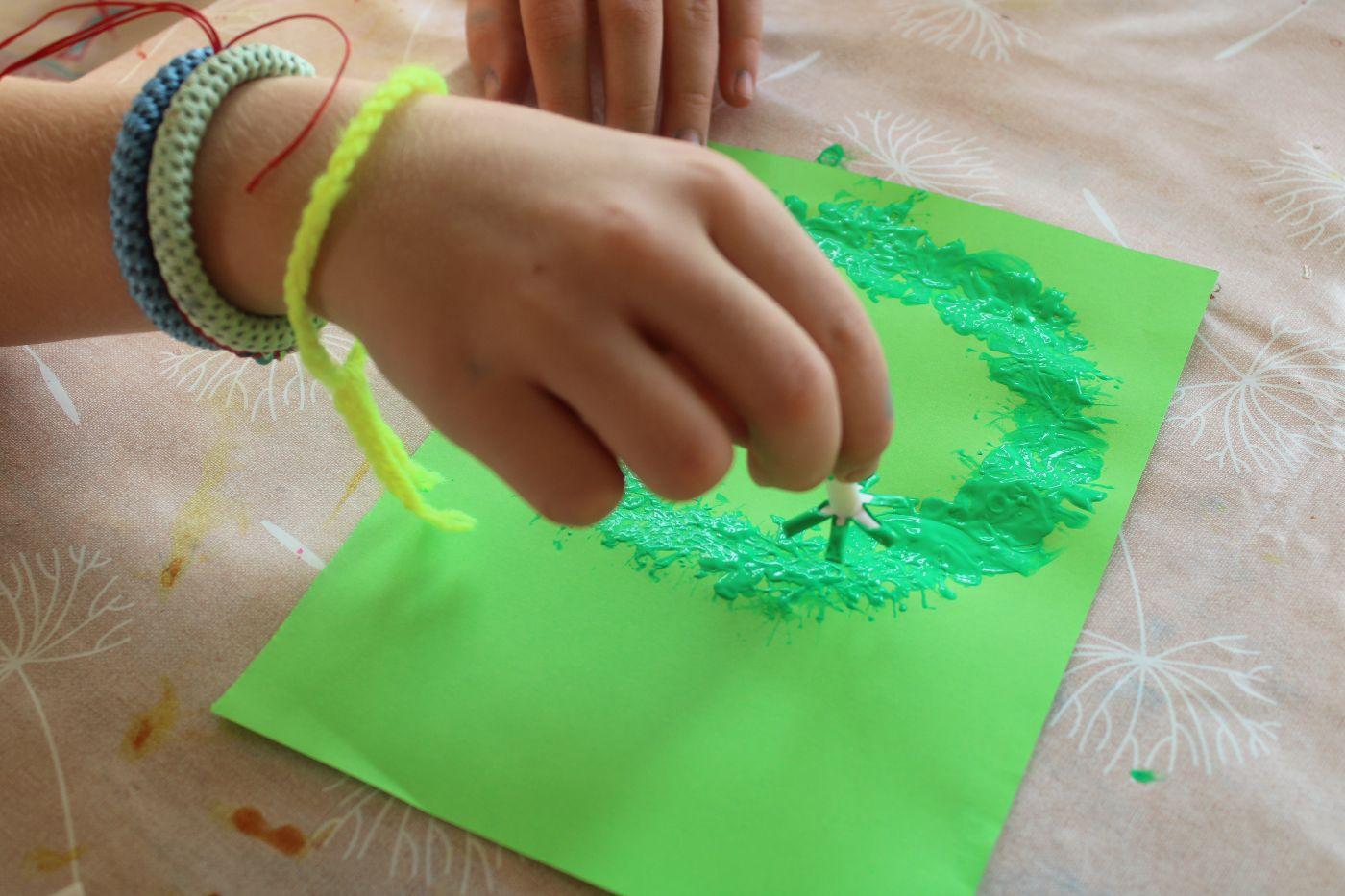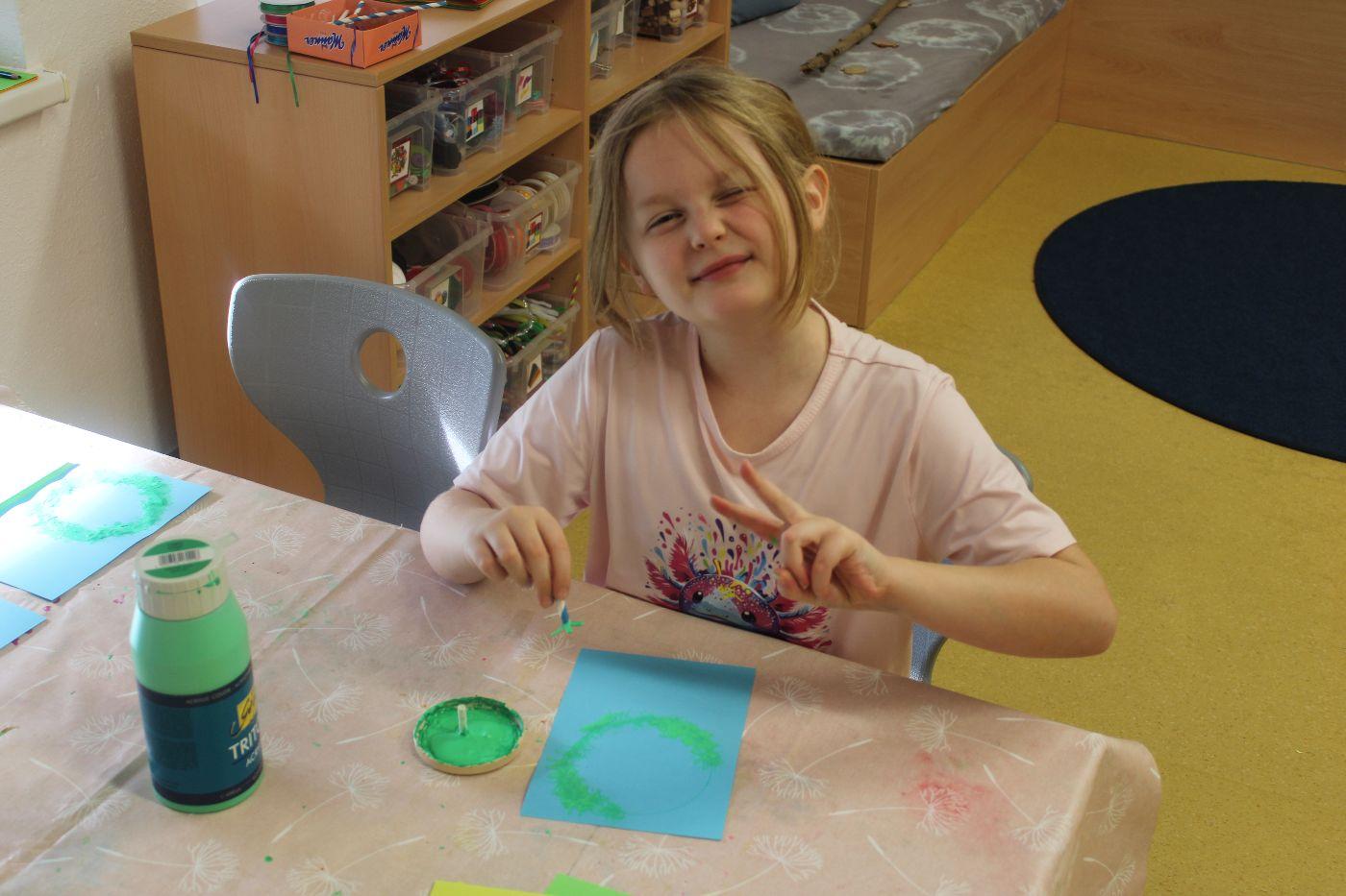 Erster Schritt: Natürlich die Einladungskarten! Im Kreativraum wurden fleißig Kränze getupft und bunte Schleifen gebunden. Die Ergebnisse sind alle Unikate, die ihr - liebe Eltern und Erziehungsberechtigte - nun Zuhause habt!