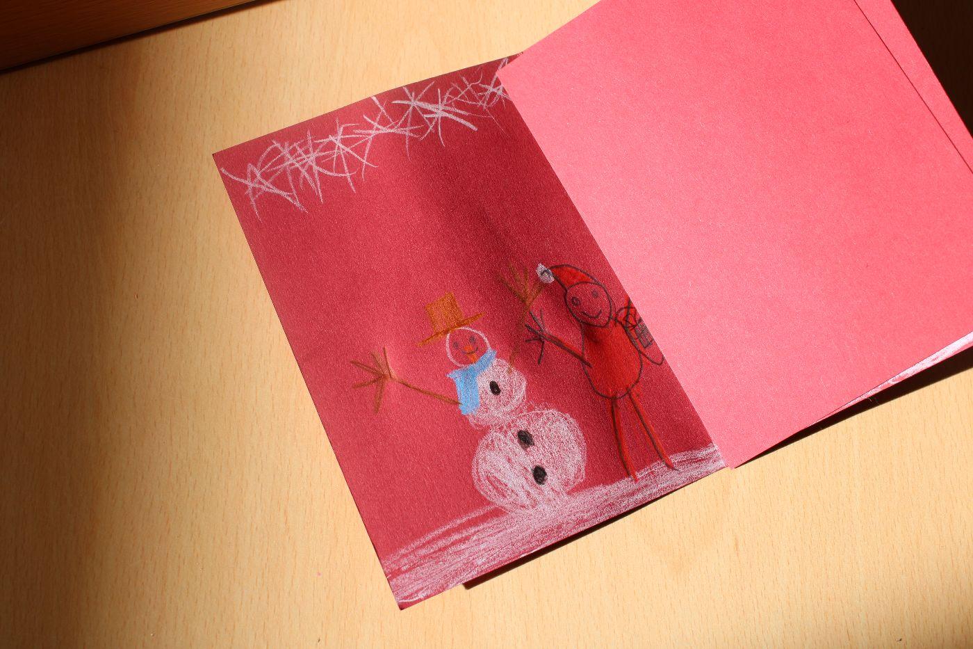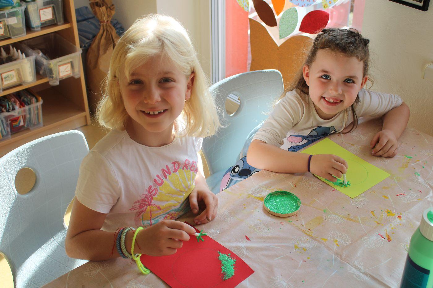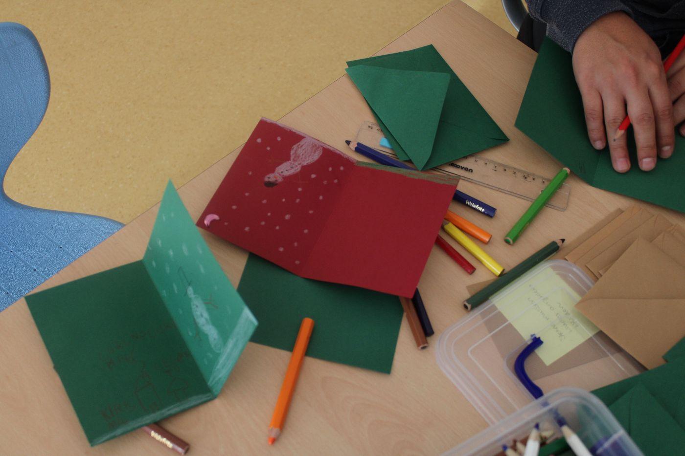 Nebenan im Bauraum wurden die Dankeskarten für unsere Sponsor:innen bemalt. Die Karten selbst sind vom letzten Jahr übrig und werden daher dieses Jahr recycelt, die Kinder haben nur noch neue Kunstwerke hineingemalt.